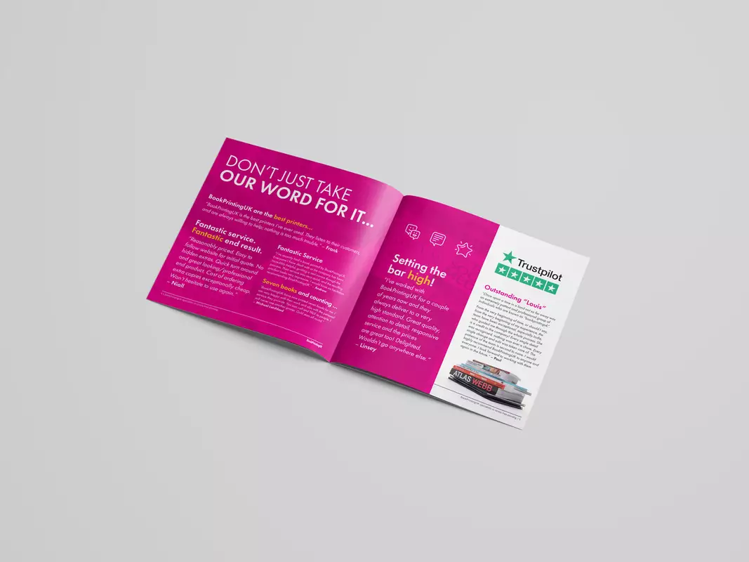 The binding you choose for your brochure will depend on your page count. If you have a small number of pages (up to 48) then we would suggest going for a booklet. If you have more than 48 pages then a paperback will be the way to go.